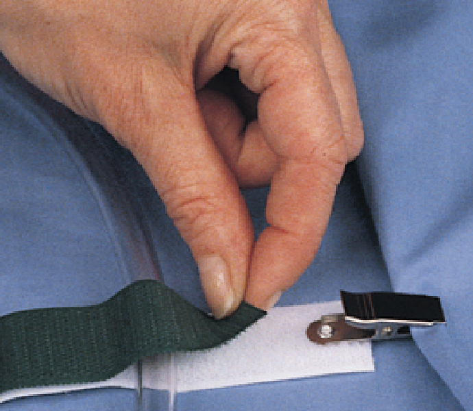 Metal spring-loaded clip secures cord catch to bedding or surgical drapes